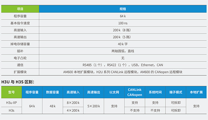 产品简介 H3S系列PLC是汇川技术开发的第三代高性能小型PLC,采用新一代独具匠心的PLC 架构技术,在增加更多丰富功能的情况下持续提升性能。配合完整且严格的软件测试过程,使得PLC 稳定可靠,值得信赖。 产品特性及优点 1、高性能,大容量,轻松应对日益复杂的工艺需求; 2、丰富的运动控制功能,让您的设备精确运动无误; 3、灵活的网络特性,支持以太网,让信息化与自动化无缝连接; 4、更加易用的软件:友好的图形化界面,简化您的应用; 5、适用于小型自动化设备行业,主要应用于产线自动化、木工机械、玻璃机械、搬运、上下料、电子非标等先进制造业; 6、支持程序存储空间 64K 步,数据存储容量 48K 字; 7、2路串口支持 MODBUS、监控等其他协议; 8、1 路100M 的以太网接口支持MODBUS TCP/IP 和自由口协议; 9、5 路200KHz 脉冲输出,丰富的定位控制指令,可以实现S 曲线加减速、凸轮同步控制,支持2 轴直线和圆弧插补; 10、8 路200KHz 高速输入,实现单相、AB 相脉冲计数,支持中断和脉冲捕捉功能; 11、编程口支持 USB 接口和以太网接口两种通用接口。 标准版特性 1、提供8 通道 200k 高速脉冲输入; 2、提供5 通道 200k 高速脉冲输出,更加丰富的定位指令,支持 S 曲线加减速; 3、高速输出支持两轴圆弧,直线插补; 4、提供独立串行通信COM0、COM1,并支持 USB 监控下载; 5、主模块自带以太网接口,支持Modbus - TCP; 6、主模块自带CAN通信接口,支持 CANopen、CANlink协议; 7、程序空间提升至64k 步,存储于 Flash 中,无需电池备份; 8、掉电保持文件寄存器R元件 32k 字,D元件 8k 字,无需电池备份; 9、综合扫描速度相比H2U-XP提升 150%; 10、支持带参数子程序开发; 11、支持最多8 个通用扩展模块; 12、支持8 路外部中断输入; 13、新增120 余条指令,包括浮点运算,数据块处理,矩阵处理,字符串处理,定位指令等; 14、超高亮蓝色LED 指示灯。 规格参数